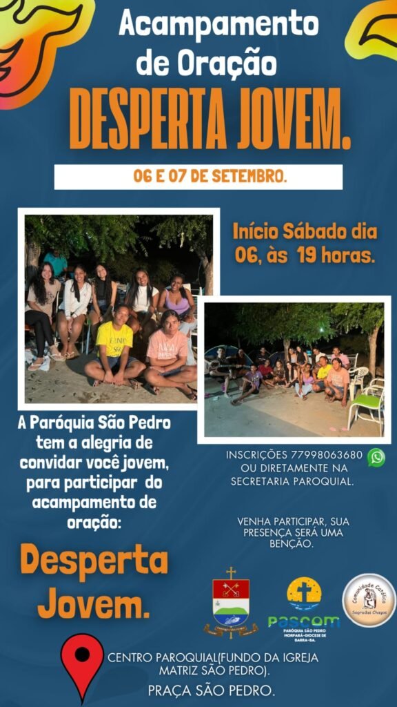 Durante os dias 06 e 07 de setembro, a paróquia São Pedro, estará realizando o Acampamento de Oração: Desperta Jovem – iniciando no sábado (06/09), às 19h. Um momento de retiro e escuta da palavra de Deus. Ocasião oportuna para o despertar para as vontades do Pai!