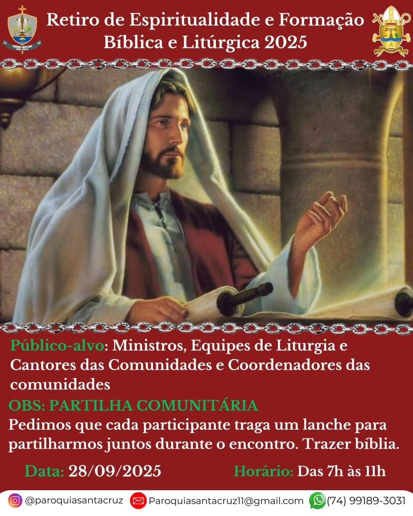 Paróquias RETIRO DE ESPIRITUALIDADE E FORMAÇÃO BÍBLICA E LITURGICA 2025 12 de setembro de 2025 Nenhum comentário