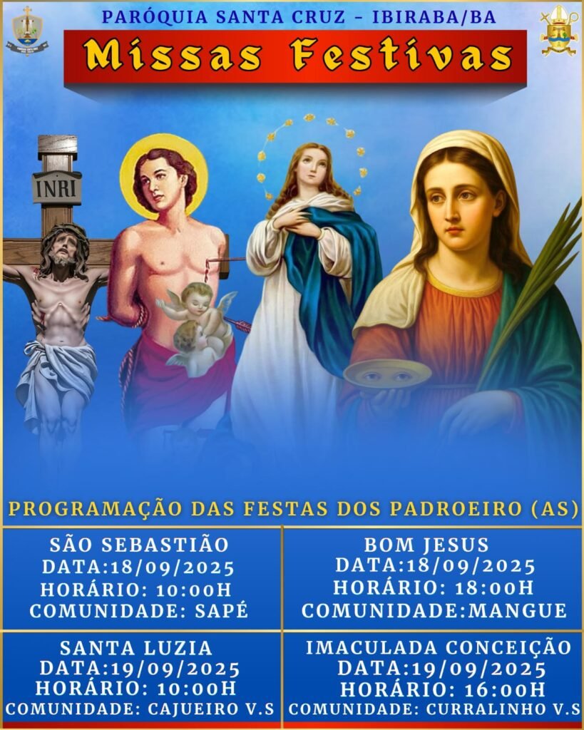 É com tamanha alegria que a paróquia Santa Cruz de Ibiraba, convida a participar de sua programação repleta de fé e devoção. Abrangendo o seu território.
